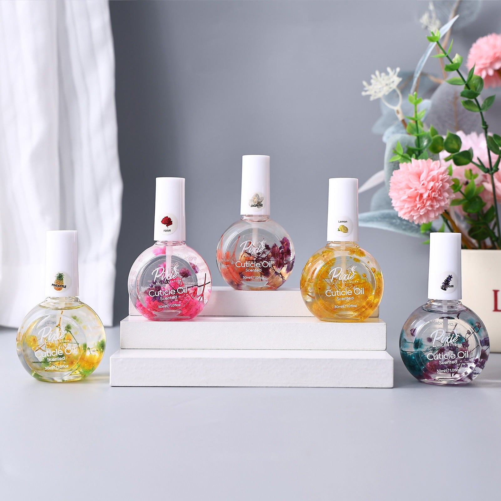 The prettiest cuticle oil around in our largest size offers an all-natural way to easily care for and strengthen your nails. Hydrate and repair your dry cuticles with essential oils that feel good and smell like Summer in a bottle. Filled with dried, natural flowers, this blend of nurturing oils softens and conditions your cuticles and restores your nails to their natural beauty. Brush on the goodness with a light floral scent. Choose one or grab all six of our great vegan flower-inspired scents.
